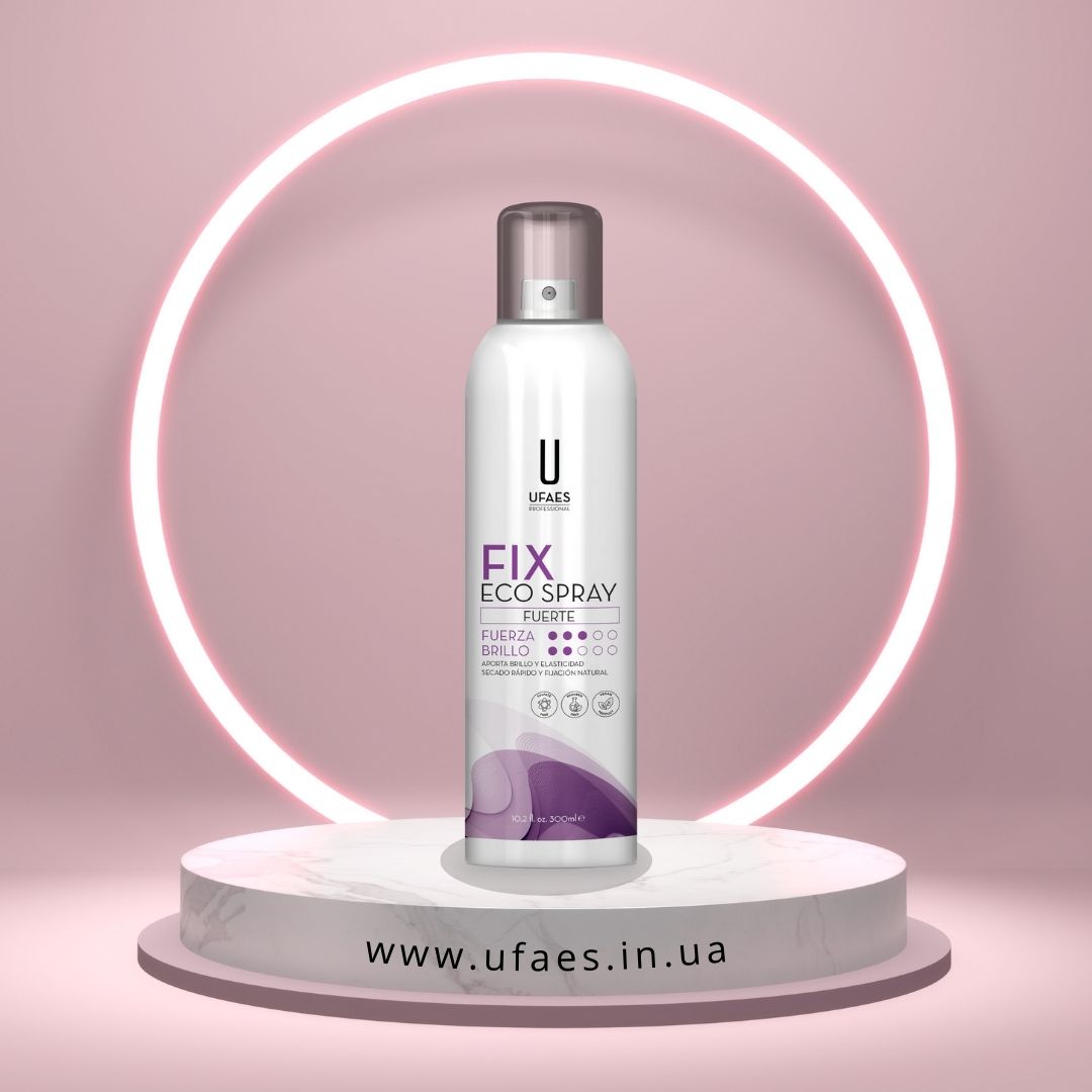 Забезпечте своєму волоссю блиск, надійну фіксацію та еластичність з еко-лаком Fix Eco Spray Fuerte UFAES! Замовляйте зараз і відчуйте різницю у догляді за волоссям.